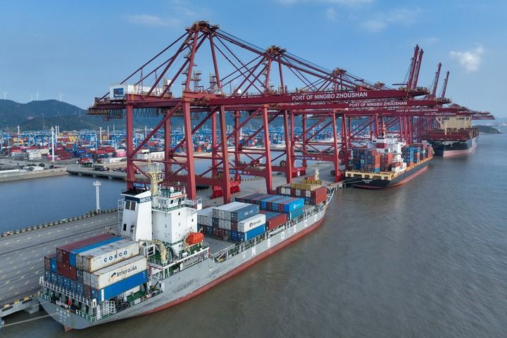 ??2025年10月13日,在寧波舟山港金塘港區大浦口集裝箱碼頭,船舶進行集裝箱裝卸作業(無人機照片)。(新華社發 鄒訓永/攝)