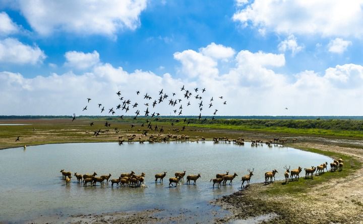 ??2025年10月11日,在江蘇東臺條子泥濕地,候鳥飛翔,成群野生麋鹿悠閑散步,一派人與自然和諧共生的生態美景(無人機照片)。(新華社發 孫家錄/攝)