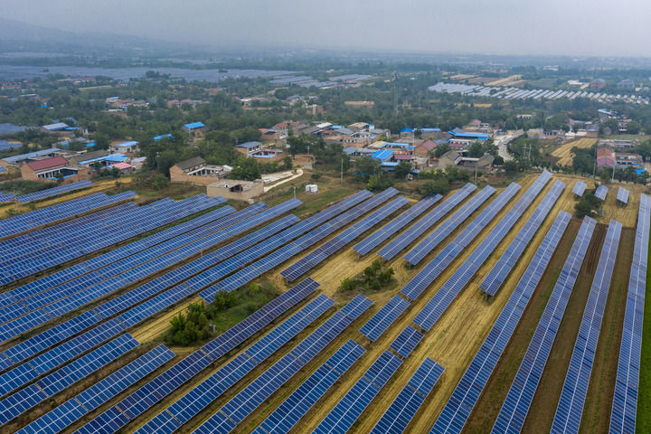 ??2025年6月25日在山西省運城市芮城縣夭上村拍攝的光伏基地(無人機照片)。(新華社記者 楊晨光/攝)