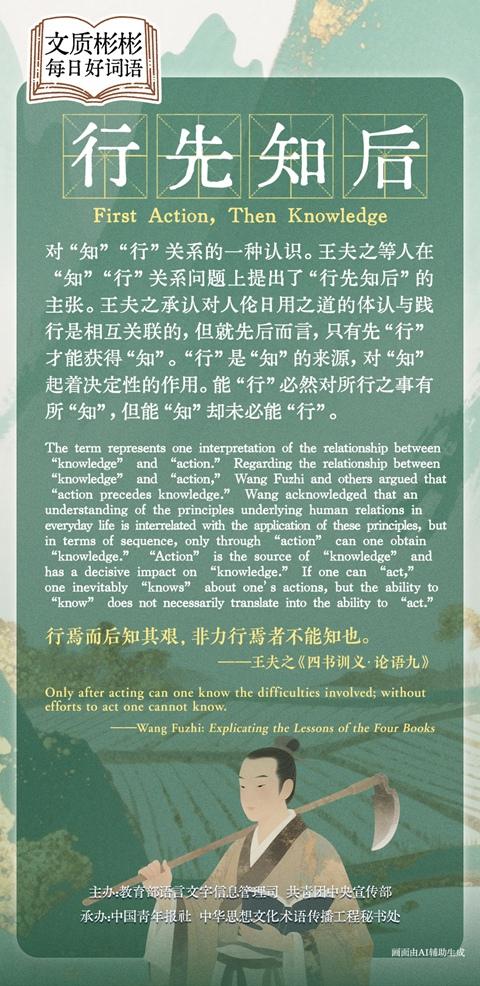 The term represents one interpretation of the relationship between "knowledge" and "action". Regarding the relationship between "knowledge" and "action", Wang Fuzhi and others argued that "action precedes knowledge". Wang acknowledged that an understanding of the principles underlying human relations in everyday life is interrelated with the application of these principles, but in terms of sequence, only through "action" can one obtain "knowledge". "Action" is the source of "knowledge" and has a decisive impact on "knowledge". If one can "act", one inevitably "knows" about one's actions, but the ability to "know" does not necessarily translate into the ability to "act".