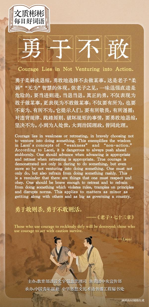 Courage lies in weakness or retreating, in bravely choosing not to venture into doing something. This exemplifies the wisdom in Laozi's concepts of "weakness" and "non-action." According to Laozi, it is dangerous to always push ahead stubbornly. One should advance when advancing is appropriate and retreat when retreating is appropriate. True courage is demonstrated not only in daring to do something, but even more so by not venturing into doing something. One must not only do, but also refrain from doing something rashly. This is a reminder that there are things that one must respect and obey. One should be brave enough to retreat and to refrain from doing something which violates rules, tramples on principles, and disrupts norms. This applies to matters as minor as getting along with others and as big as governing a country.