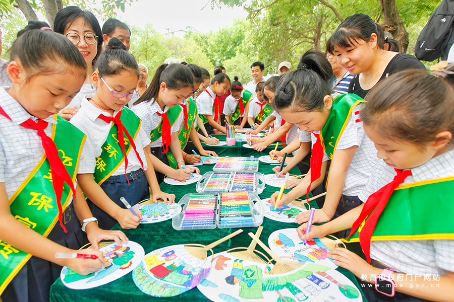 王場小學學生展示自己手繪的彩扇。近日,江蘇省徐州市王場小學開展“手繪彩扇,傳播時尚”主題假日活動,組織環保宣傳小志愿者現場繪制彩扇,贈送小區居民并向他們講解垃圾分類知識。孩子們在享受繪畫樂趣的同時積極參與環保宣傳,度過一個有意義的暑假。(蒯創/攝)