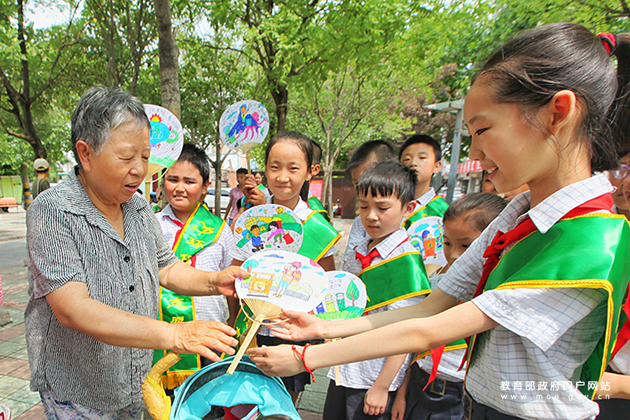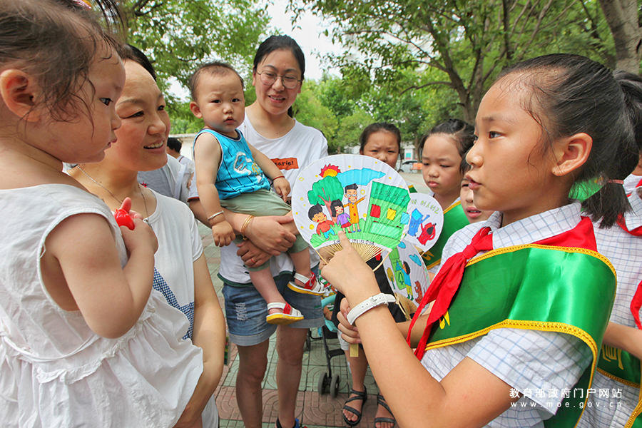 徐州市王場小學學生向居民贈送自己手繪的彩扇。(蒯創/攝)