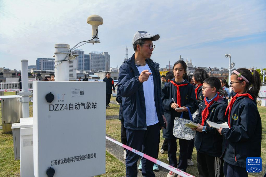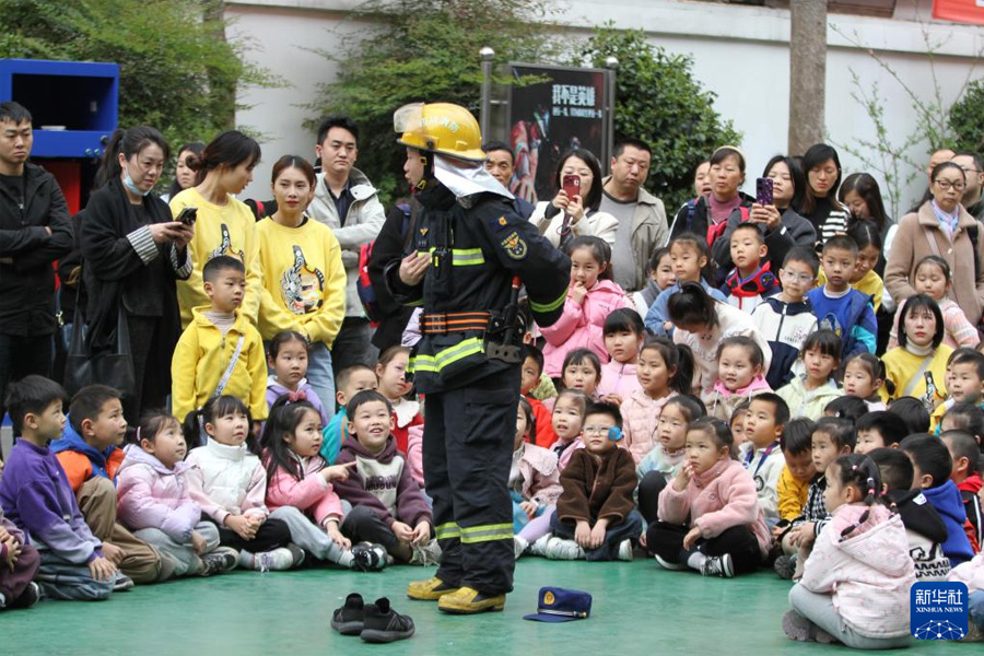 3月28日,在四川省樂山市消防救援支隊百祿路消防救援站,消防員為小朋友講解消防服裝的作用。(新華社發 李華時/攝)