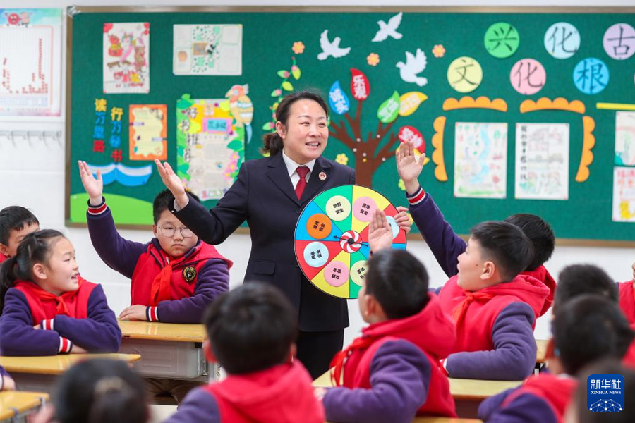 3月28日,江蘇省興化市人民檢察院未成年人法治宣講團工作人員走進興化市文峰小學,通過安全知識問答的方式給學生講解安全知識。全國中小學生安全教育日將至,各地舉行種類多樣的安全教育主題活動,提高學生的安全防范和自我保護能力。(新華社發 周社根/攝)