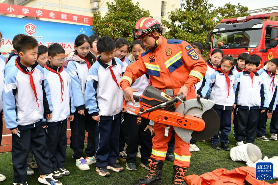 3月28日,在山東省棗莊市臺兒莊區實驗小學,消防救援隊員為學生們介紹消防器材功能。(新華社發 賈禮章/攝)