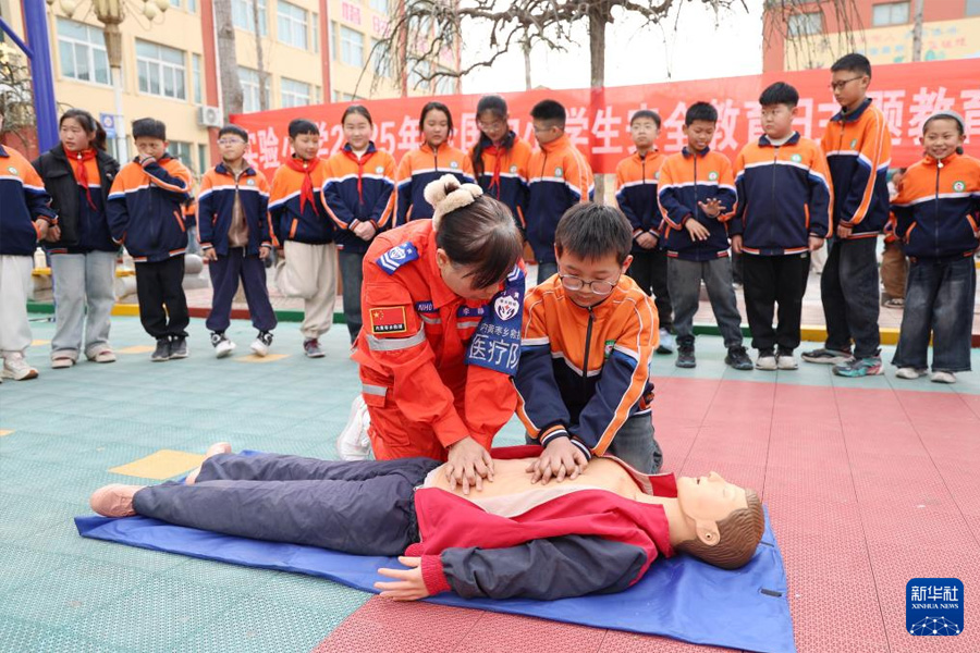 3月27日,河南省安陽市內黃縣實驗小學學生在學習心肺復蘇急救知識。(新華社發 劉肖坤/攝)