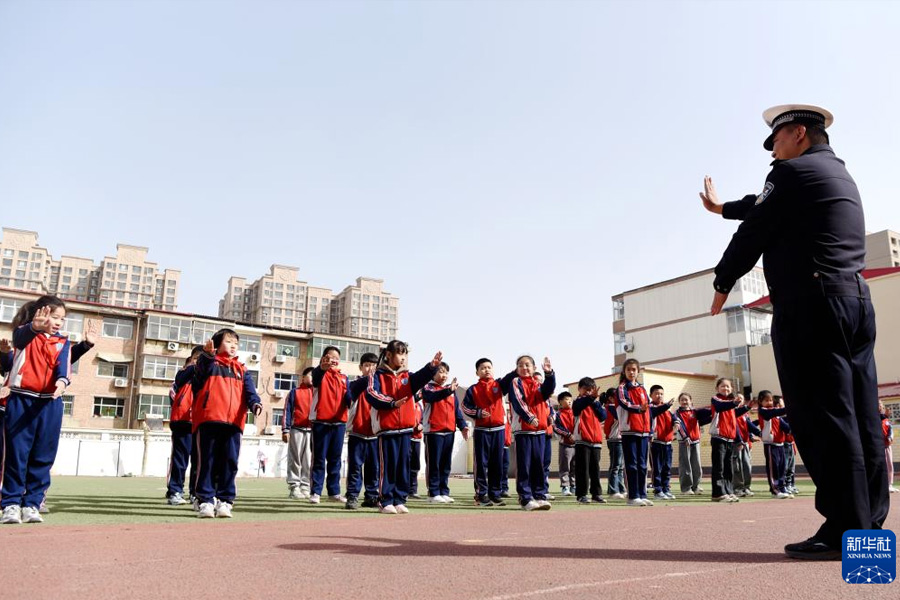 3月28日,在河北省石家莊市欒城區凌空橋路小學,交警指導學生學習交通安全知識。(新華社發 李明發/攝)