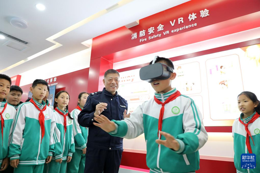 3月28日,在山東省濱州市博興縣公安局陳戶派出所“安全防范體驗館”,博興縣第七中學小學部的學生們在民警指導下采用VR技術學習消防安全知識。(新華社發 陳彬/攝)