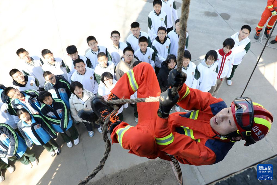 3月30日,在山東省濱州市博興縣消防救援大隊,消防救援人員向博興縣實驗中學的學生展示繩索攀爬技能。(新華社發 陳彬/攝)
