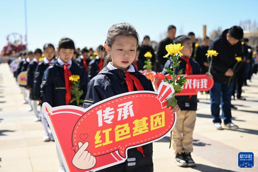 4月2日,少先隊員在內蒙古呼和浩特市大青山紅色文化公園默哀。(新華社記者 貝赫/攝)