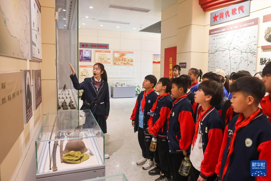 4月2日,講解員在河南省平頂山市寶豐革命紀念館為學生講述抗戰歷史。(新華社發 何五昌/攝)
