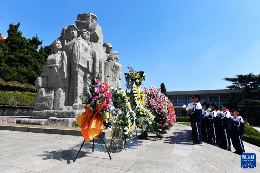 4月2日,山東省青島市市北區普新小學學生在革命烈士雕塑前獻花致敬。(新華社發 王海濱/攝)