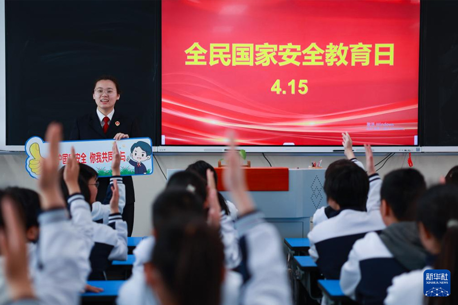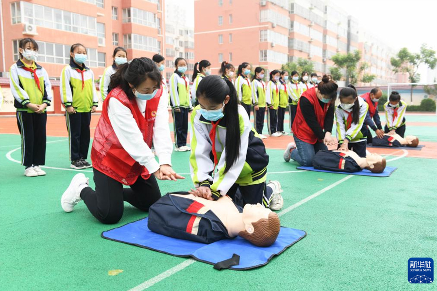 5月11日,在河北省石家莊新樂市民生街小學,志愿者向學生講解心肺復蘇急救知識。(新華社發 賈敏杰/攝)