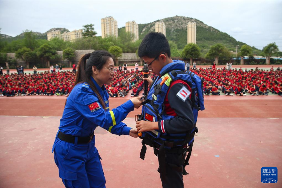 5月9日,在山東省濟南市泉海小學,藍天救援隊志愿者給學生講解、演示救援服穿法。5月12日是第17個全國防災減災日。近日來,各地開展形式多樣的防災減災宣傳教育及演練培訓活動,提高人們科學防災意識和災害避險自救能力。(新華社發 郝鑫城/攝)