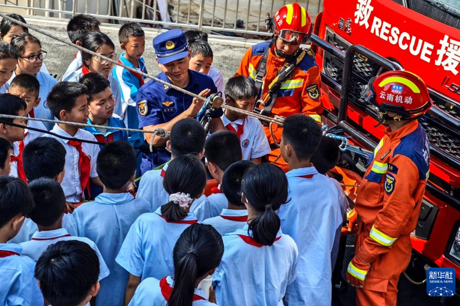 5月9日,在云南省普洱市景谷縣森林消防中隊,消防員向學生講解滑輪在救援中的運用。(新華社發 郭元首/攝)