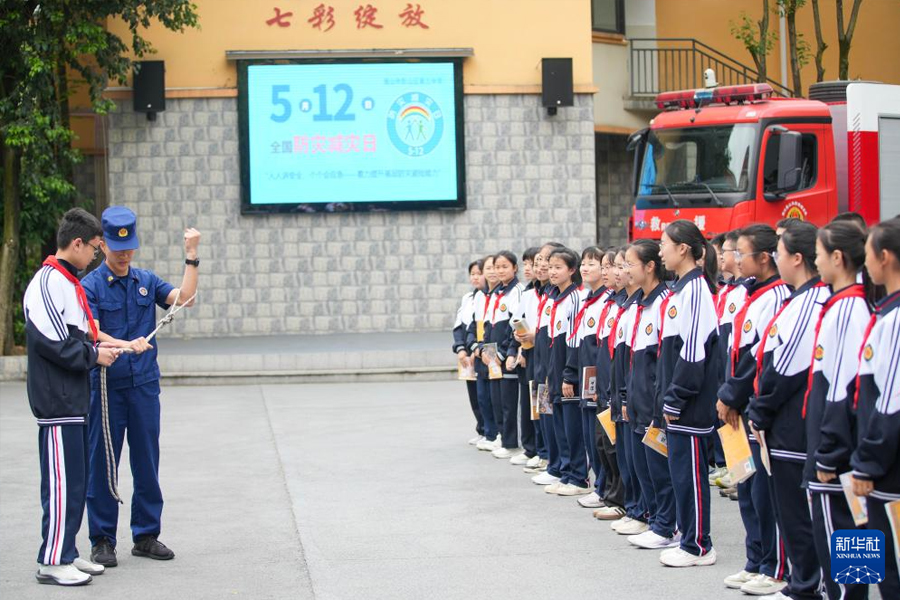 5月9日,消防救援人員給四川省眉山市彭山區第三中學的學生講解安全繩知識。(新華社發 翁光建/攝)