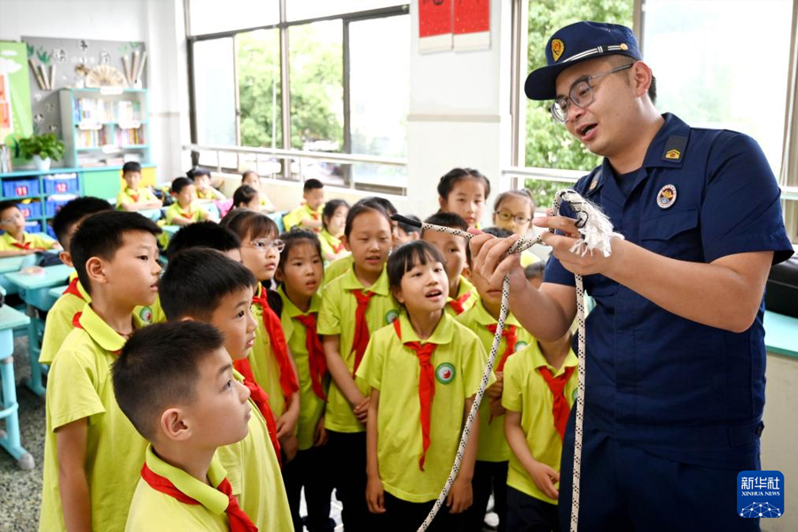 5月9日,浙江省武義縣消防大隊救援人員為武義縣實驗小學學生講解逃生繩的使用方法。(新華社發 張建成/攝)