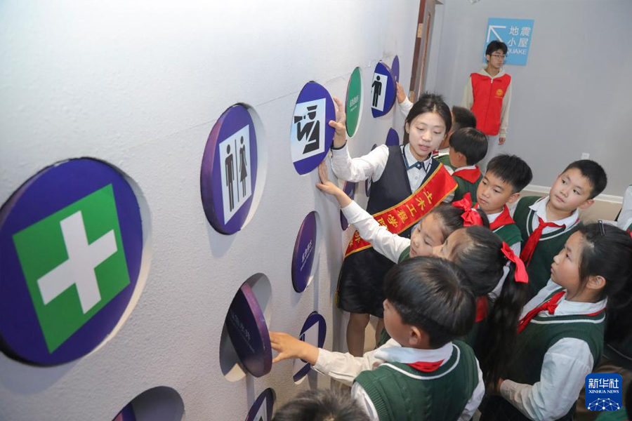 5月8日,江蘇省徐州市瀟湘路學校的學生在防震減災教育科普基地學習避險標志。(新華社發 白雪/攝)