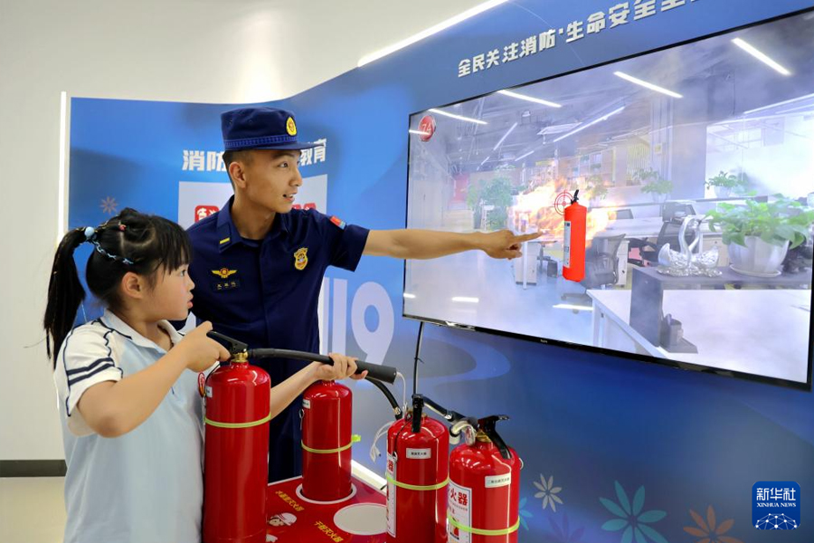 5月11日,在山東省濱州市陽信縣勞店鎮科普教育大廳,小朋友在消防救援隊員的指導下進行模擬滅火訓練。(新華社發 初寶瑞/攝)