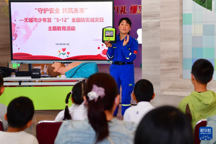 5月11日,在江蘇省無錫市少年宮,無錫藍天救援隊隊員為小朋友和家長講解AED急救設備使用方法。(新華社發 還月亮/攝)