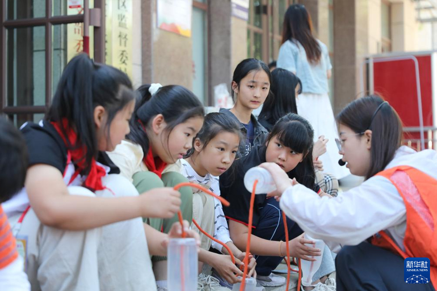 5月11日,學生在河南省焦作市溫縣岳村街道慈勝社區防災減災宣傳活動現場學習制作拋繩器。(新華社發 黃福興/攝)