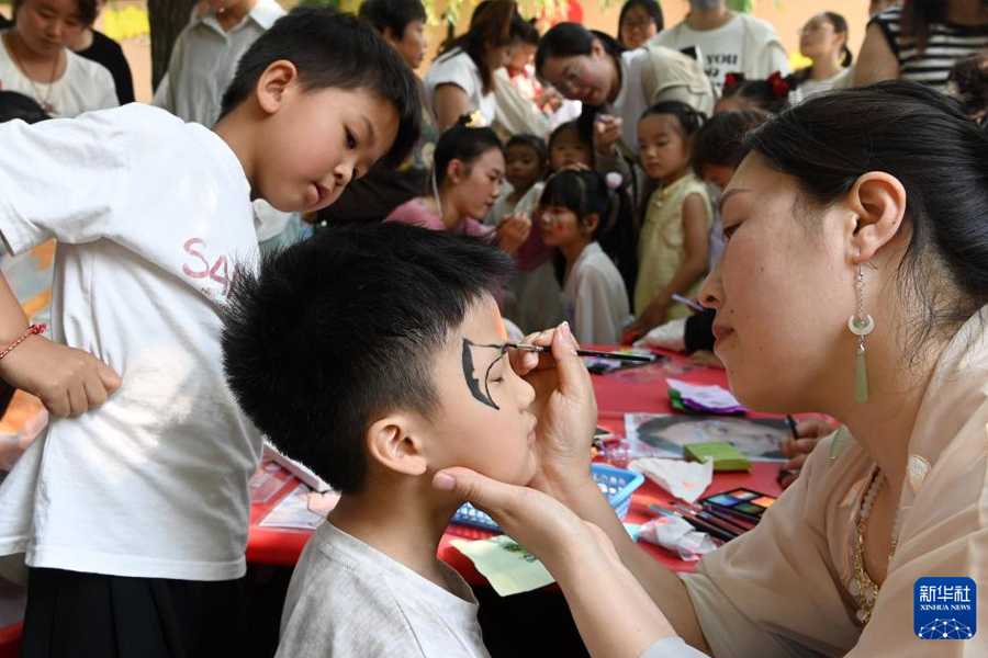 5月28日,在河南省沁陽市白莊村幼兒園,老師為小朋友畫面部彩繪。端午節和兒童節臨近,各地開展豐富多彩的活動,讓孩子們感受傳統節日魅力。(新華社發 楊帆/攝)
