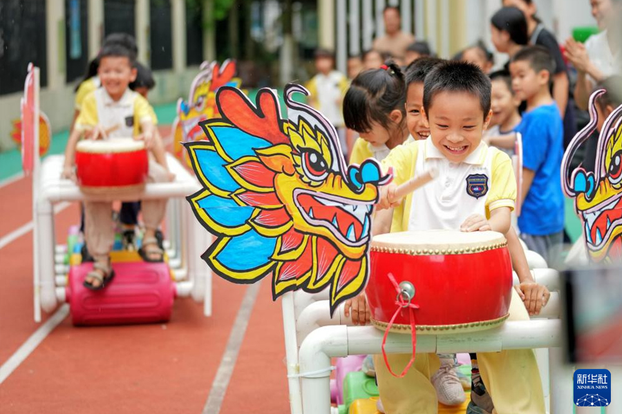 5月28日,在廣西南寧市邕寧區第三幼兒園,小朋友進行旱地劃龍舟比賽。(新華社發 馬華斌/攝)
