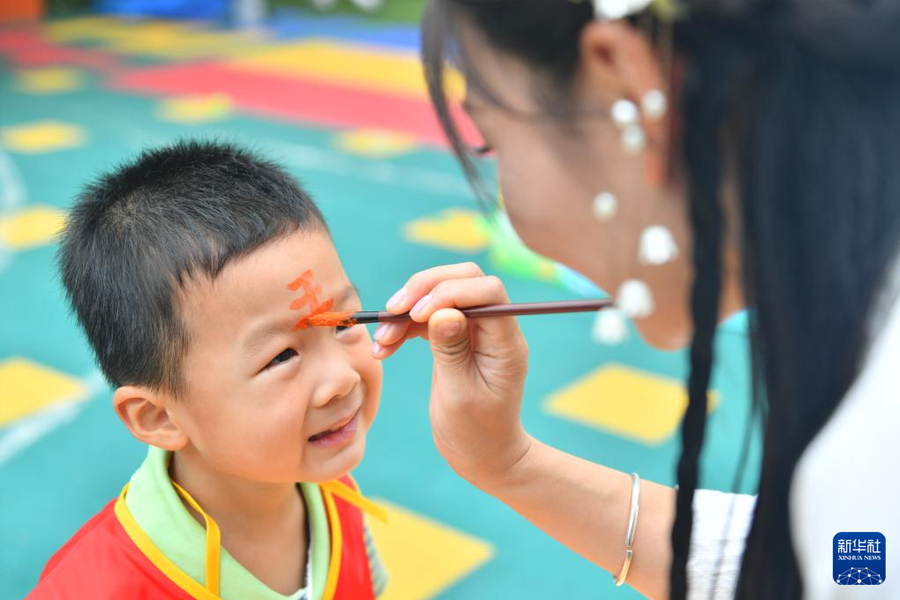 5月27日,在江西省吉安市吉州區馨悅幼兒園,老師蘸取雄黃為孩子額頭點上“王”字。(新華社發 張建明/攝)
