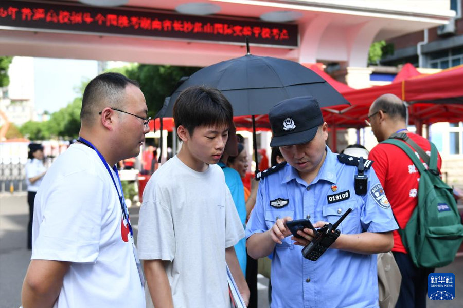6月7日,在湖南省長沙麓山國際實驗學??键c外,民警為遺落身份證的考生辦理手續。(新華社記者 陳振海/攝)