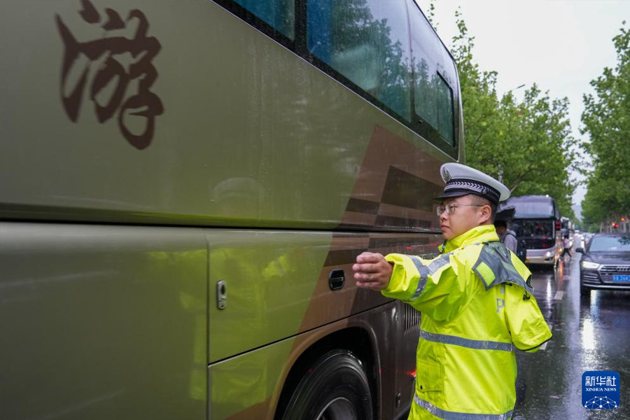 6月7日,在南京市建鄴區中華中學考點外,南京交警四大隊的交通警察在指揮交通。(新華社記者 李博/攝)