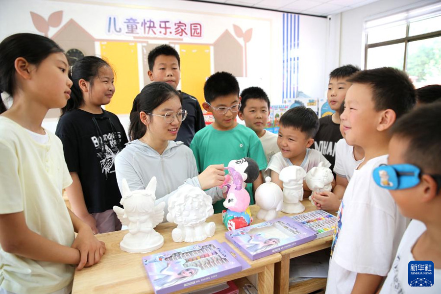7月7日,大學生志愿者和孩子們一起在江蘇省連云港市連云區墟溝街道院前社區公益暑托班上彩繪泥塑。(新華社發 王春/攝)