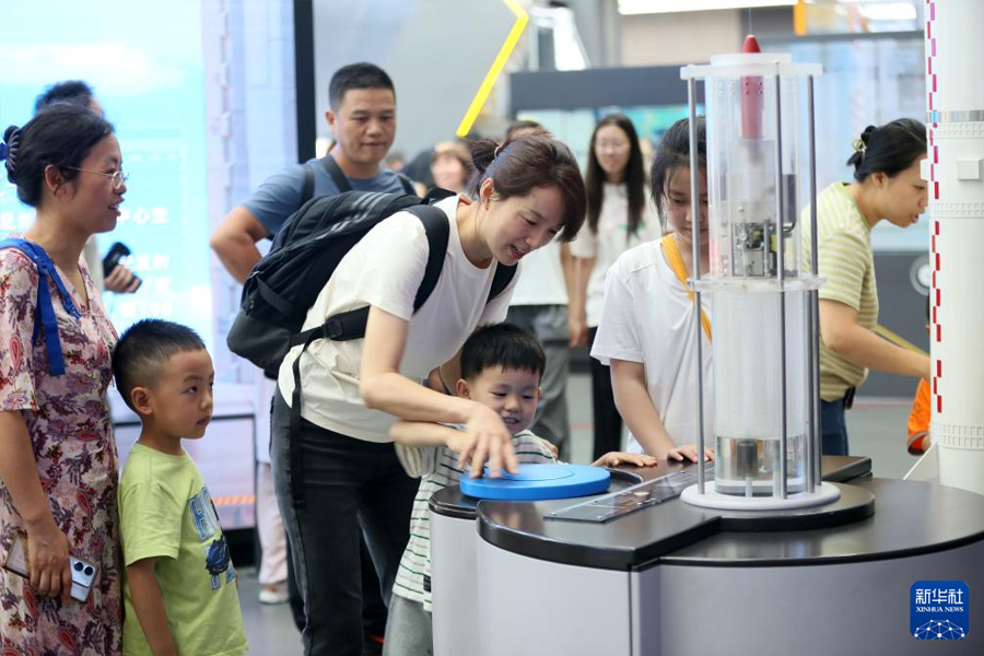 7月5日,家長帶著孩子在四川科技館體驗科普設備。(新華社發 李華時/攝)