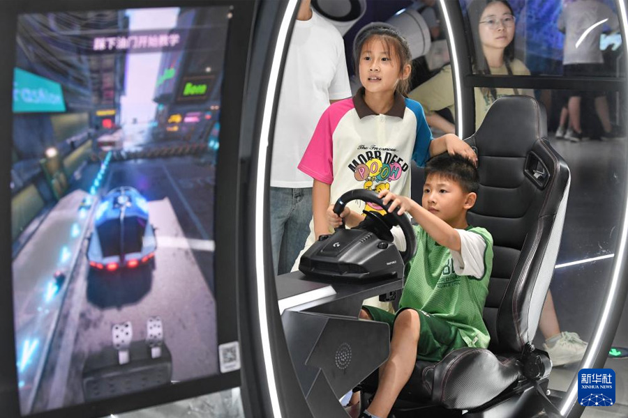 7月6日,青少年在安徽省科學技術館體驗新能源賽車。(新華社發 陳三虎/攝)