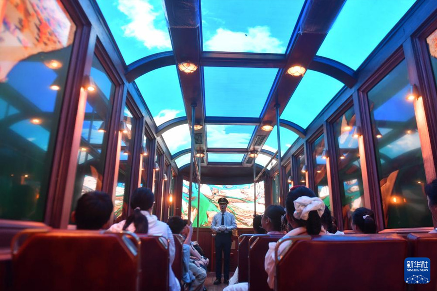 7月6日,小學生在位于山東省青島市中山路的數字電車里聽解說員介紹。(新華社發 王海濱/攝)
