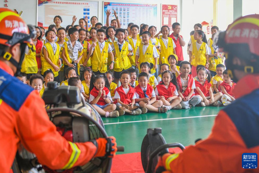 7月25日,在湖南省永州市道縣消防救援大隊,消防救援人員給孩子們普及消防器材使用知識。(新華社發 蔣克青/攝)