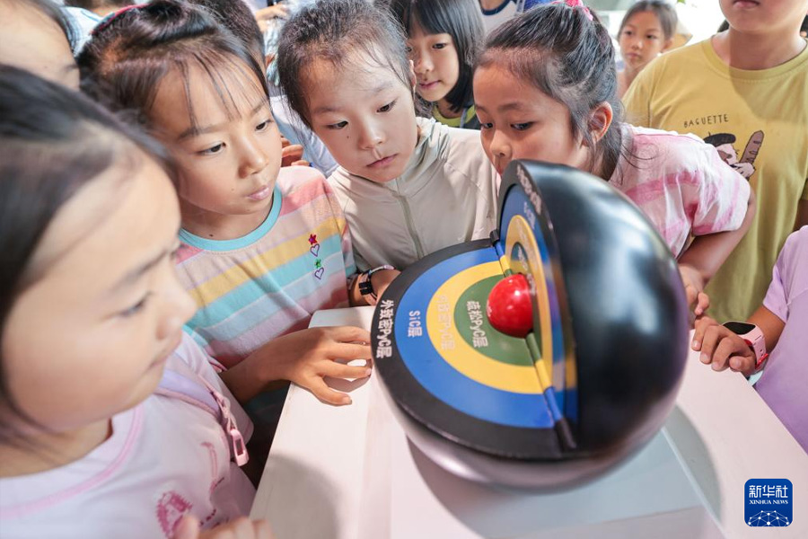 7月25日,孩子們在山東榮成華能石島灣核電科技館參觀。(新華社發 李信君/攝)
