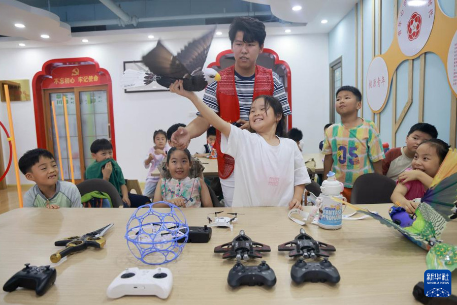 7月25日,在山東省臨沂市蘭山區銀雀山街道桃源社區暑假托管班上,蘭山區機器人協會的志愿者協助小朋友體驗鷹造型的無人機。(新華社發 許傳寶/攝)