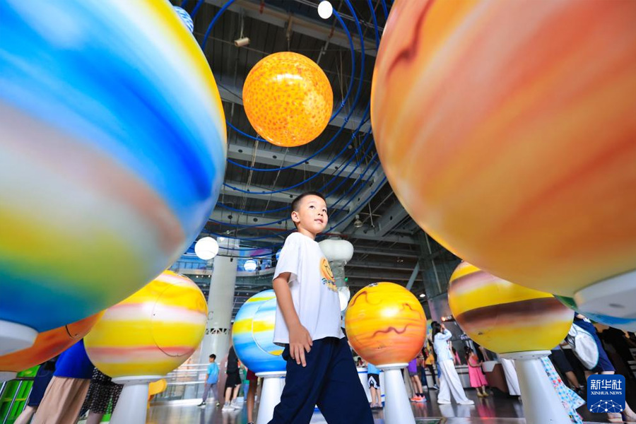 7月26日,小朋友在南京科技館觀看科普裝置。(新華社發 蘇陽/攝)