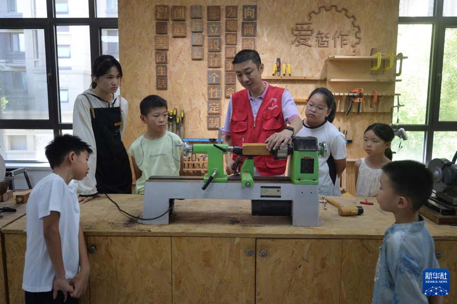 7月26日,在山東省青島市城陽區夏莊街道華安路社區開展的暑期愛心輔導活動上,志愿者為小朋友們演示木工車床工作原理。(新華社發 王海濱/攝)