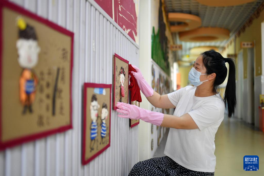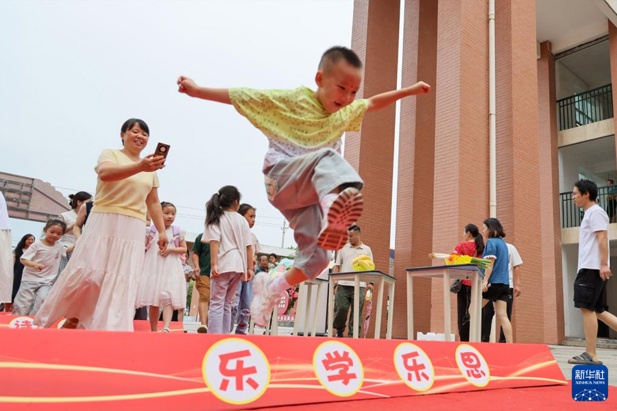 9月1日,湖北省咸寧市浮山學校新入學的小學生跨越“成長跨欄”,喜迎新學期。(新華社發 吳濤/攝)