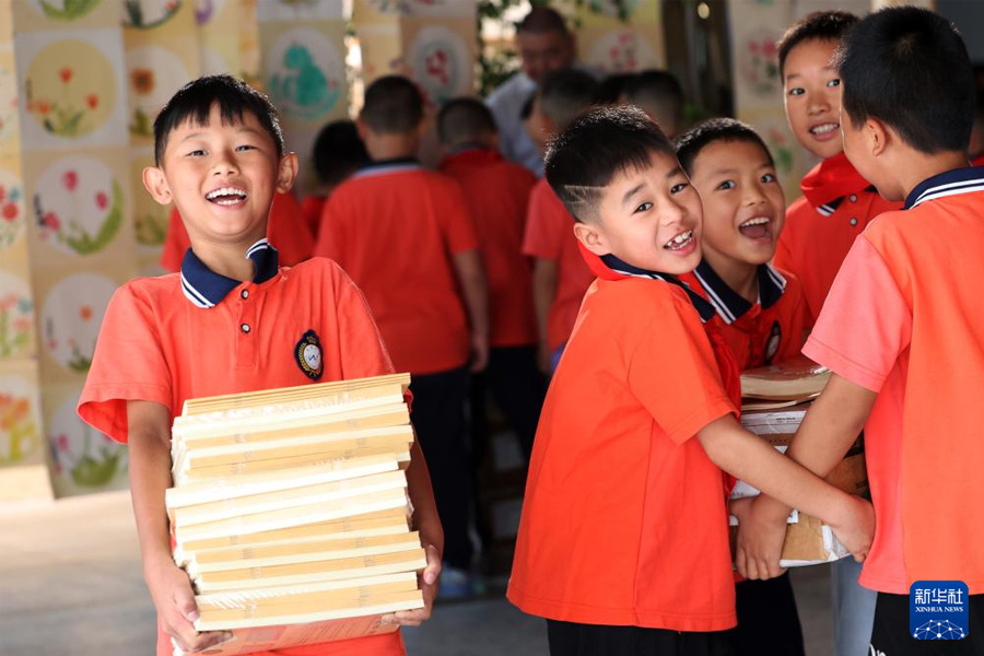9月1日,重慶市黔江區武陵小學二年級學生在領取新書。(新華社發 楊敏/攝)