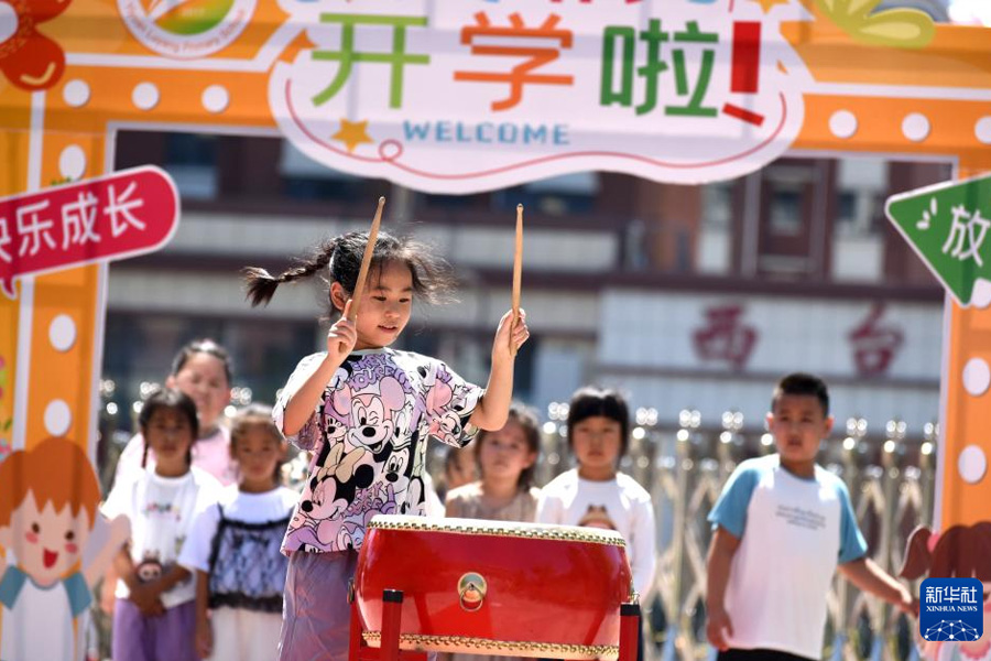 9月1日,山東省淄博市沂源縣魯陽小學新入校的小學生在開學第一課上擊鼓鳴志。(新華社發 趙東山/攝)