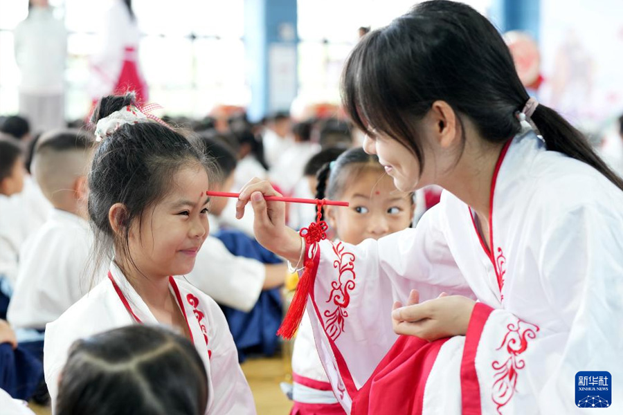9月1日,廣西南寧市邕寧區龍崗北小學老師在給一年級新生點朱砂。(新華社發 馬華斌/攝)