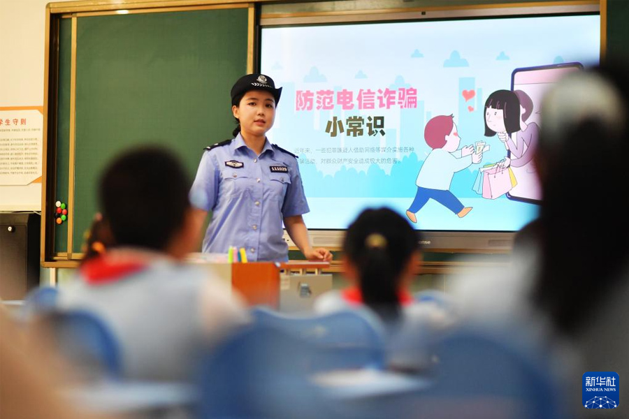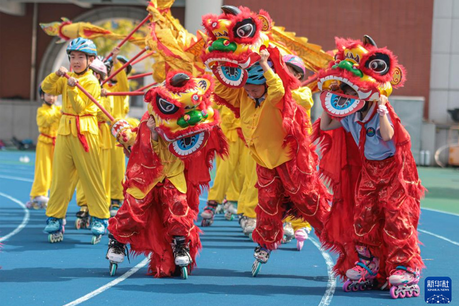 9月29日,在山東省榮成市實驗小學,孩子們表演舞龍舞獅。國慶、中秋將至,各地組織開展豐富多彩的活動,喜迎“雙節”。(新華社發 李信君/攝)