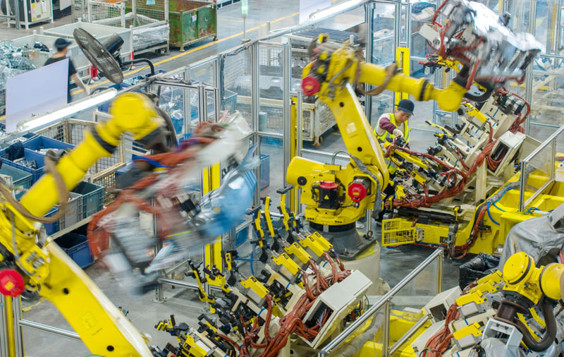 ??浙江省湖州市長興經濟技術開發區的長興地通汽車部件有限公司技術人員操控工業機器人生產新能源汽車配件(無人機照片,2025年10月9日攝)。(新華社發 譚云俸/攝)