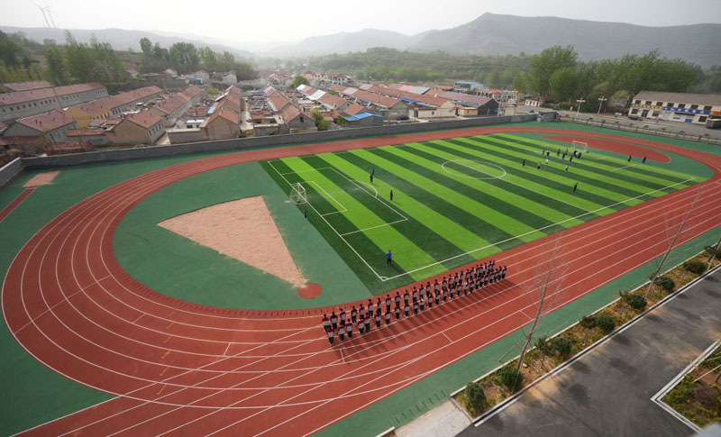 ??在位于山東濰坊市臨朐縣石家河村的臨朐縣彌水教育集團石家河校區,學生在操場塑膠跑道上進行體育鍛煉(2025年4月17日攝)。(新華社記者 徐速繪/攝)